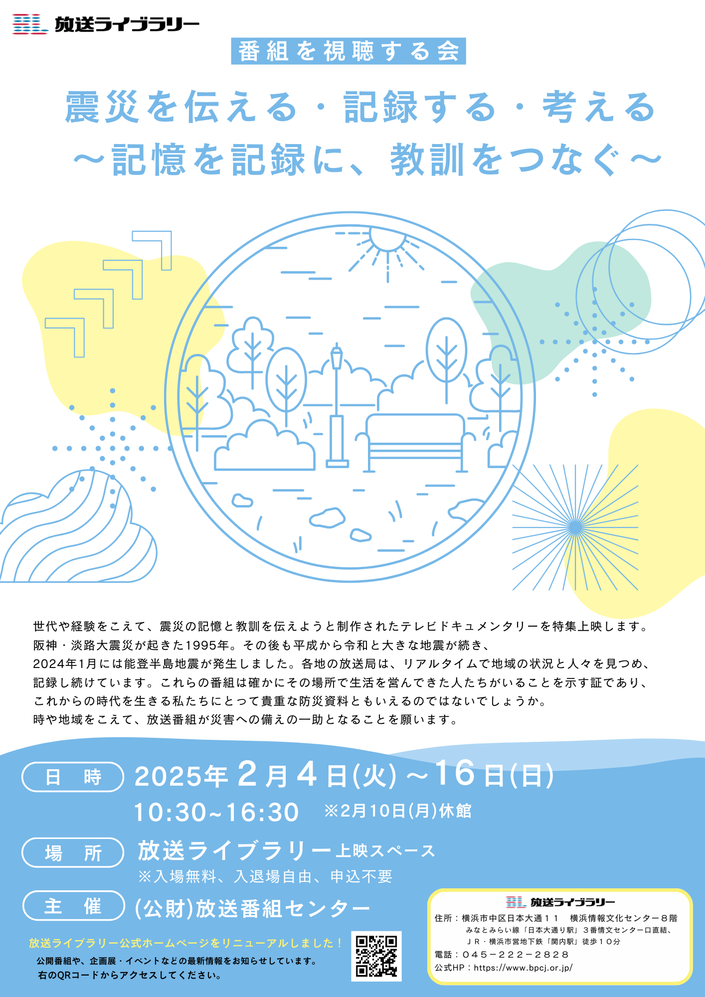 阪神・淡路大震災が起きた1995年。その後も、平成から令和と大きな地震が続き、2024年1月には能登半島地震が発生しました。各地の放送局はリアルタイムで地域の状況と人々を見つめ、記録し続けています。これらの番組は確かにその場所で生活を営んできた人たちがいることを示す証であり、これからの時代を生きる私たちにとって貴重な防災資料ともいえるのではないでしょうか。時や地域をこえ、放送番組が災害への備えの一助となることを願います。