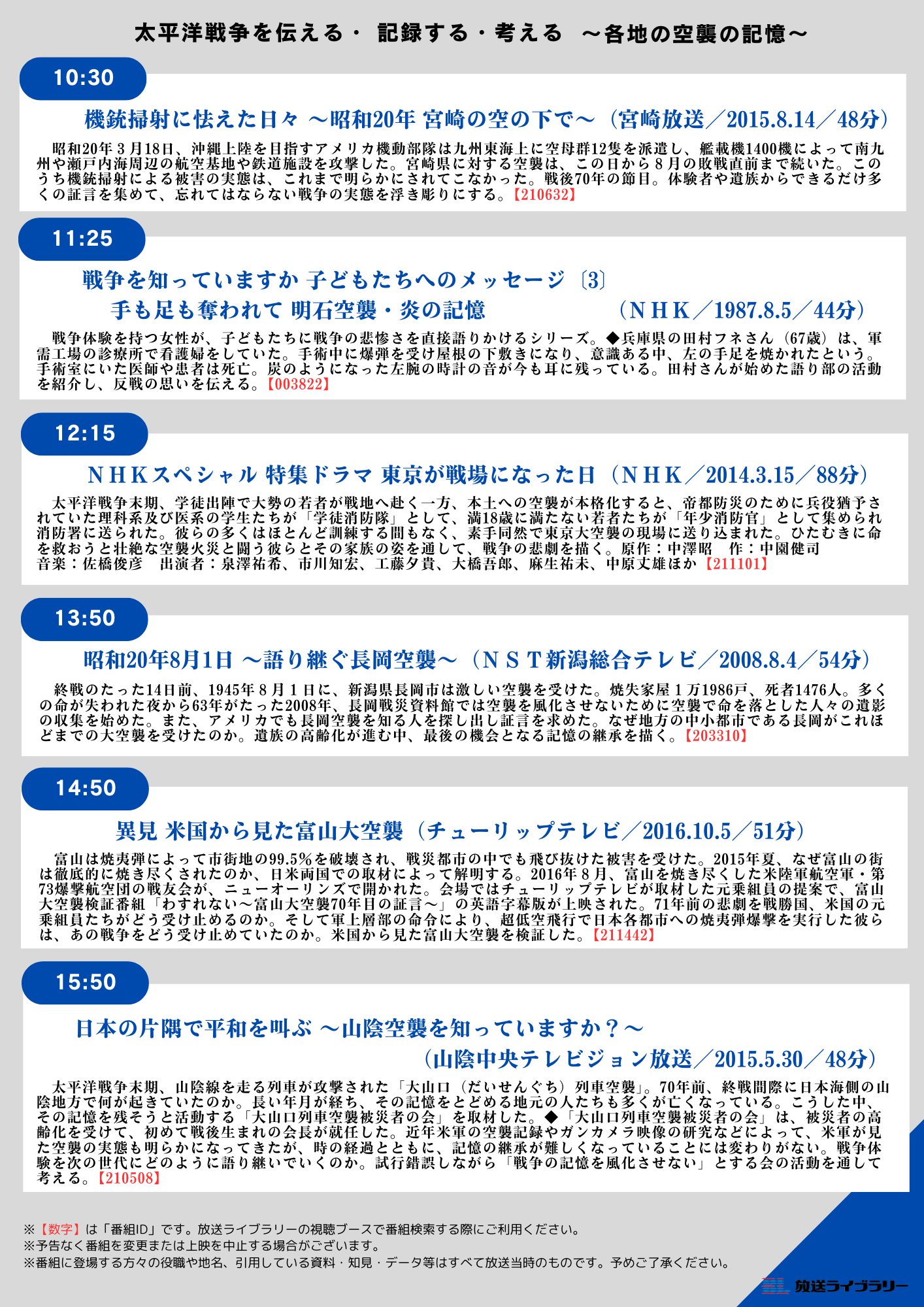 【上映プログラム】(放送局/放送日/分数)全6本(予定)