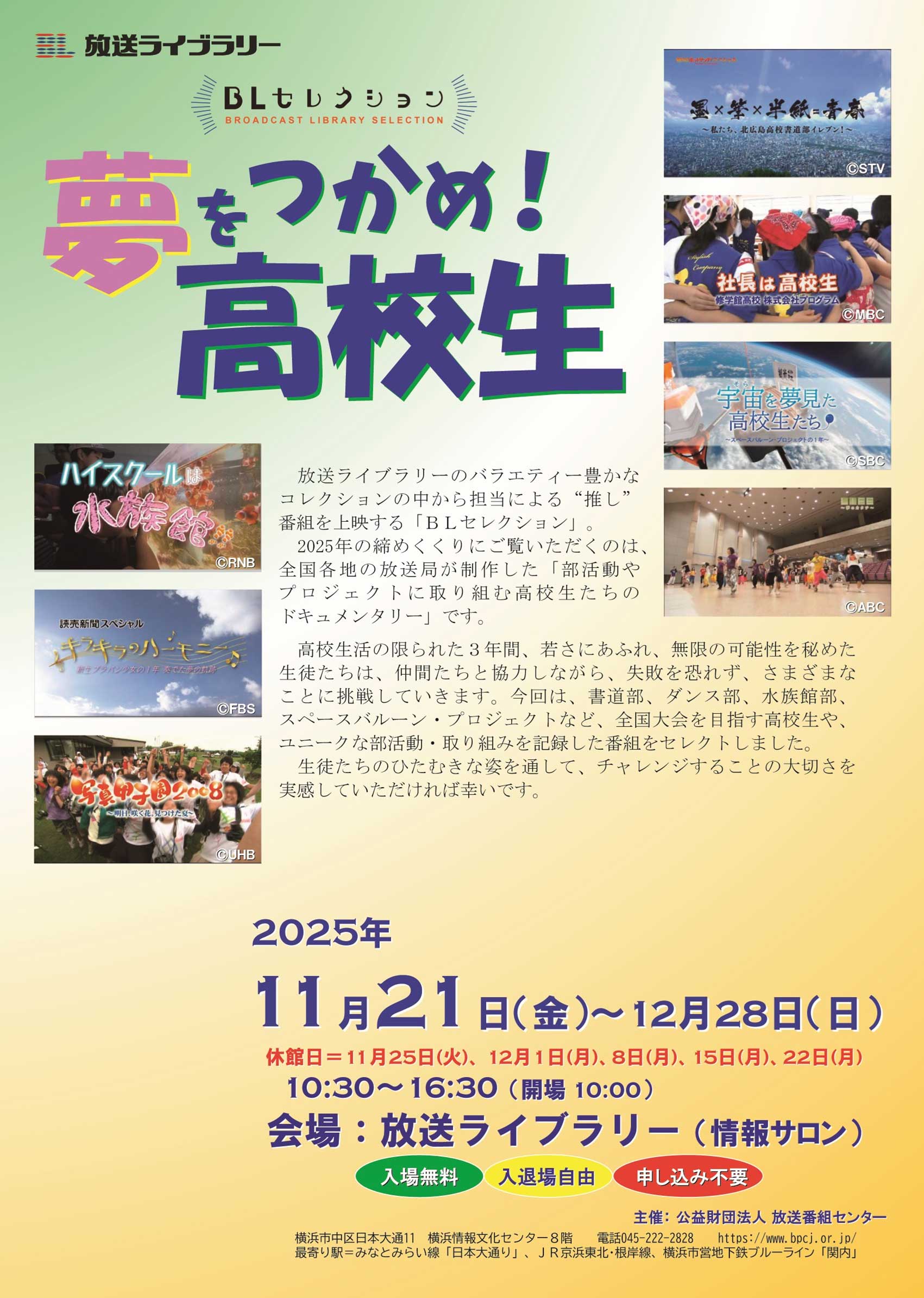 放送ライブラリーのバラエティー豊かなコレクションから、担当による“推し”の番組を選んで上映する「BLセレクション」。今回は、全国各地の放送局が制作した「部活動やプロジェクトに取り組む高校生たちのドキュメンタリー」を特集上映します。