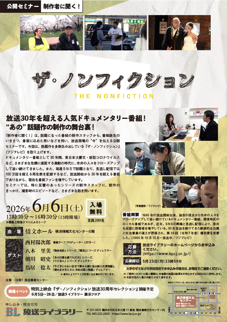 「制作者に聞く!」は、話題になった番組の制作スタッフから、番組誕生のいきさつ、番組に込めた思いなどを伺い、放送現場の“今”を伝える公開セミナーです。