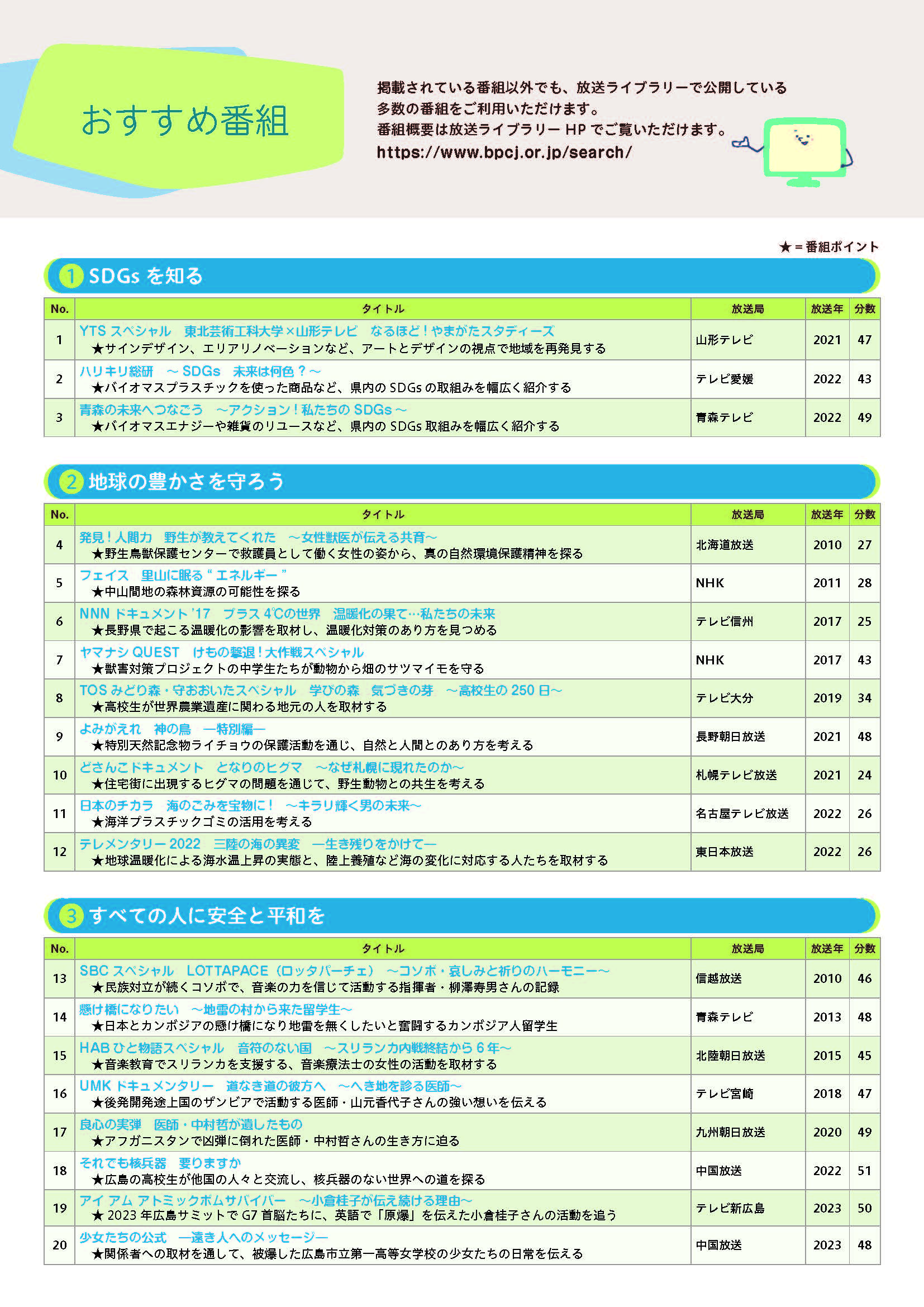 持続可能な開発目標「SDGs」に関連した番組の中で、大学の授業で使用された、「瀬戸内海がゴミ箱になる日」を紹介します。この番組のほか、全国各地の放送局が、地域の問題を取材し、その実態を伝え、解決への糸口を探るべく番組を制作しています。17 の目標を達成するためには何をすればよいのか、自分はどのように貢献できるかを考えるヒントになれば幸いです。