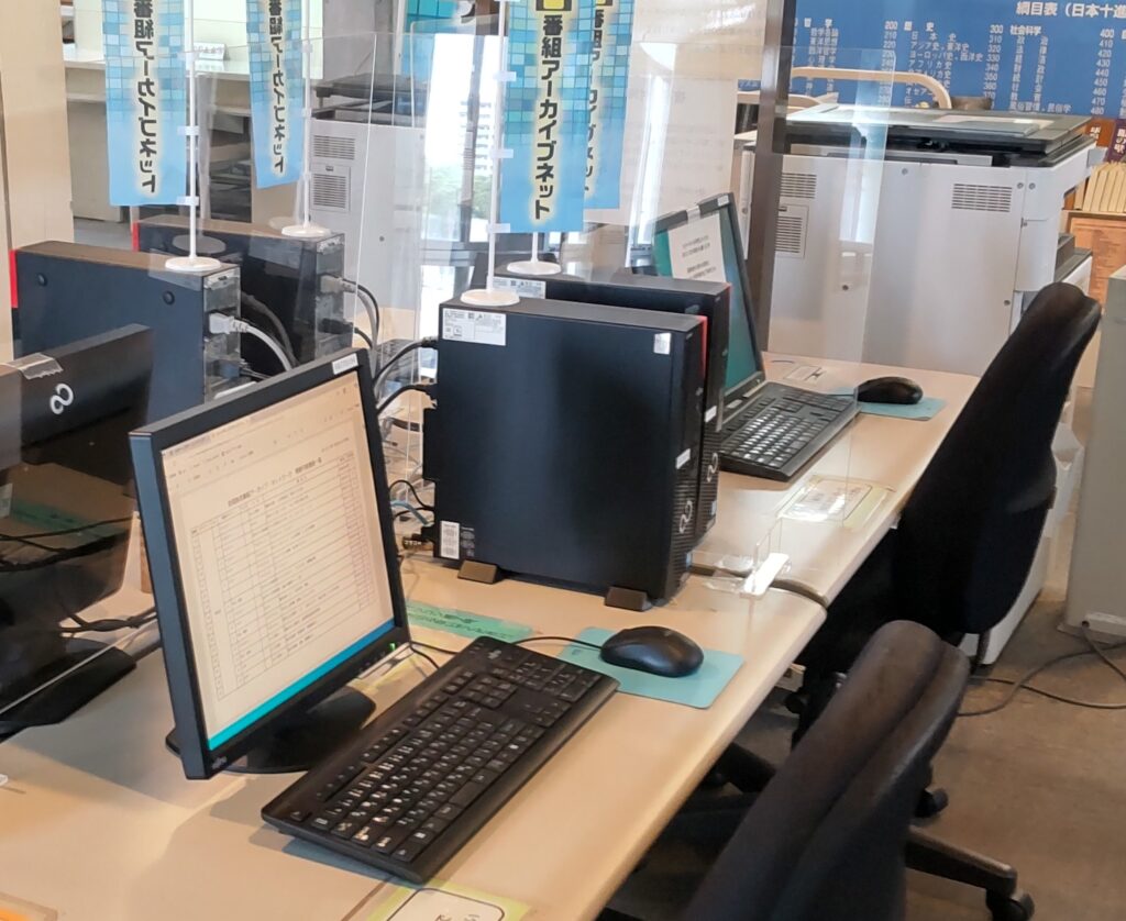 図書館2階参考資料室にあるインターネット閲覧コーナーのパソコン(4台)で、放送ライブラリーの公開番組の中から選りすぐった420番組を誰でも無料で視聴できます。番組は随時追加していきます。